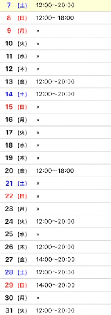 今日は 12:00 ~ 20:00 までの受付予定です。